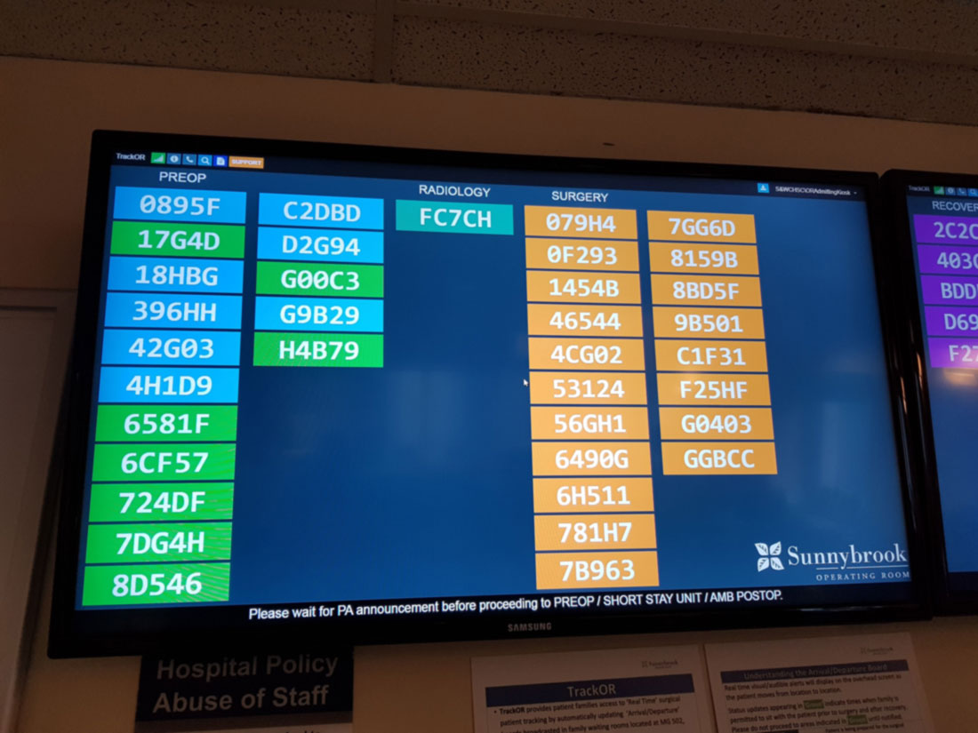 It all starts in the surgery admission room where you check-in and get a number. That number is unique to the patient and will move across the board as the patient moves through different stages of the surgery. This is a great way for your loved one to track where you are throughout the day.